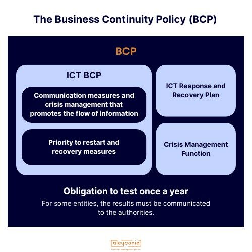 Indeed, in the event of a crisis interrupting the activity of the structure, it will be necessary to plan for the gradual, organized and concerted restart of operations. This recovery strategy must be thought out upstream, in a cold phase and not improvised. To support this resumption of activity, DORA also requires that crisis management communication measures be defined in advance in order to promote the circulation of information in a degraded crisis situation.