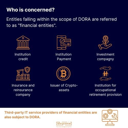 Article 2 of the regulation provides us with a large list of bodies falling within its scope, while taking care in its latest version to exclude certain entities. All the entities concerned are summarized under the generic name of “financial entities”. Third-party IT service providers of financial entities will also be subject to DORA.