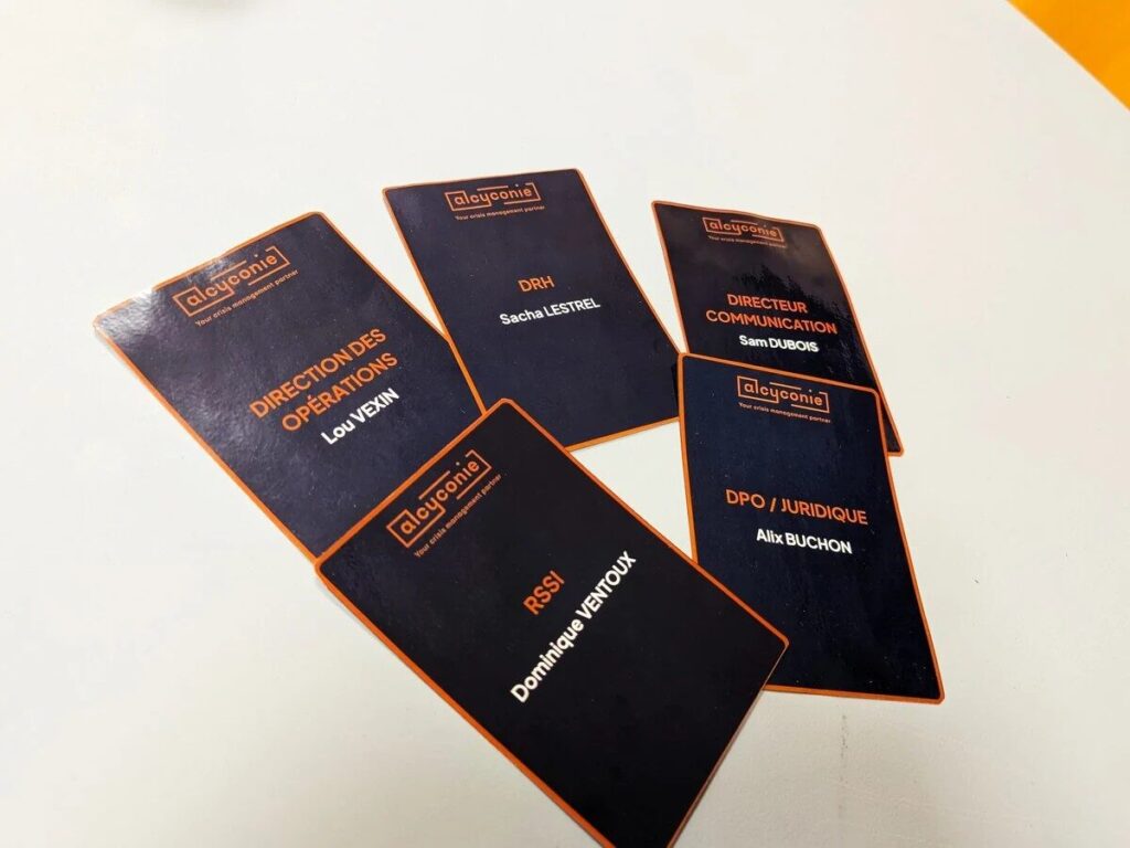 « La crise, pour beaucoup, c’est je remonte les manches et je mets les mains dans le cambouis. Ce qu’on attend des cellules stratégiques, c’est de prendre les décisions. » Chaque participant reçoit une carte avec son rôle (RSSI, DRH, directeur juridique, DSI, communicant et autres), et ses identifiants pour accéder à la simulation.
